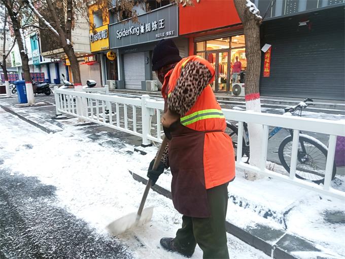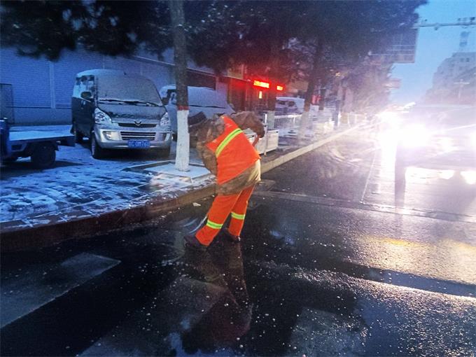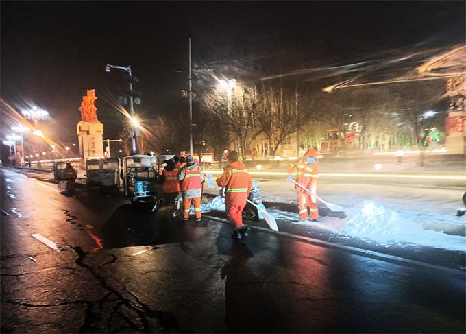 雪在飘、风在吼、灯光在摇曳。在八旗广场、伊通大街、中华路等路段,环卫工人身着醒目的橙色工装,带着扫帚、铁锹、除雪机等工具,默默奔赴各自作业路段,为扫平障碍浴雪奋战。他们有的挥舞着扫帚清扫路面浮雪,有的用铁锹铲除人行步道的冰层,有的驾驶清雪车轰鸣开道,大家分工协作,有条不紊,橙色的身影在渐渐苏醒的黎明中来回穿梭,成为小城冬日里最动人的风景。