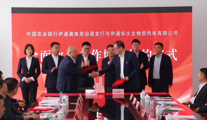 中国农业银行伊通分行行长赵国锋与伊通华大生物质热电有限公司相关负责人签约全面业务合作协议。